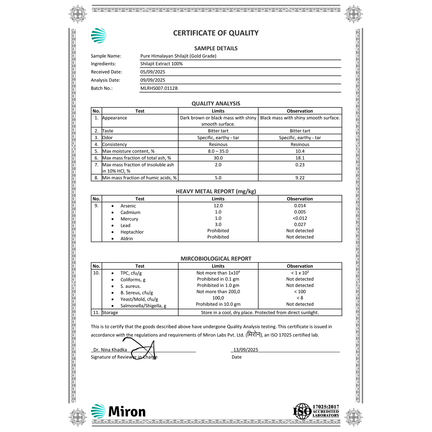 At Real Himalayan Shilajit, we are dedicated to providing the purest and most potent Himalayan Shilajit. To ensure the highest quality and safety of our products, each batch undergoes rigorous testing by certified laboratories. Our Certificates of Analysis (CoA) and Certificates of Quality (CoQ) provide detailed insights into the composition, purity, and safety of every product you purchase.